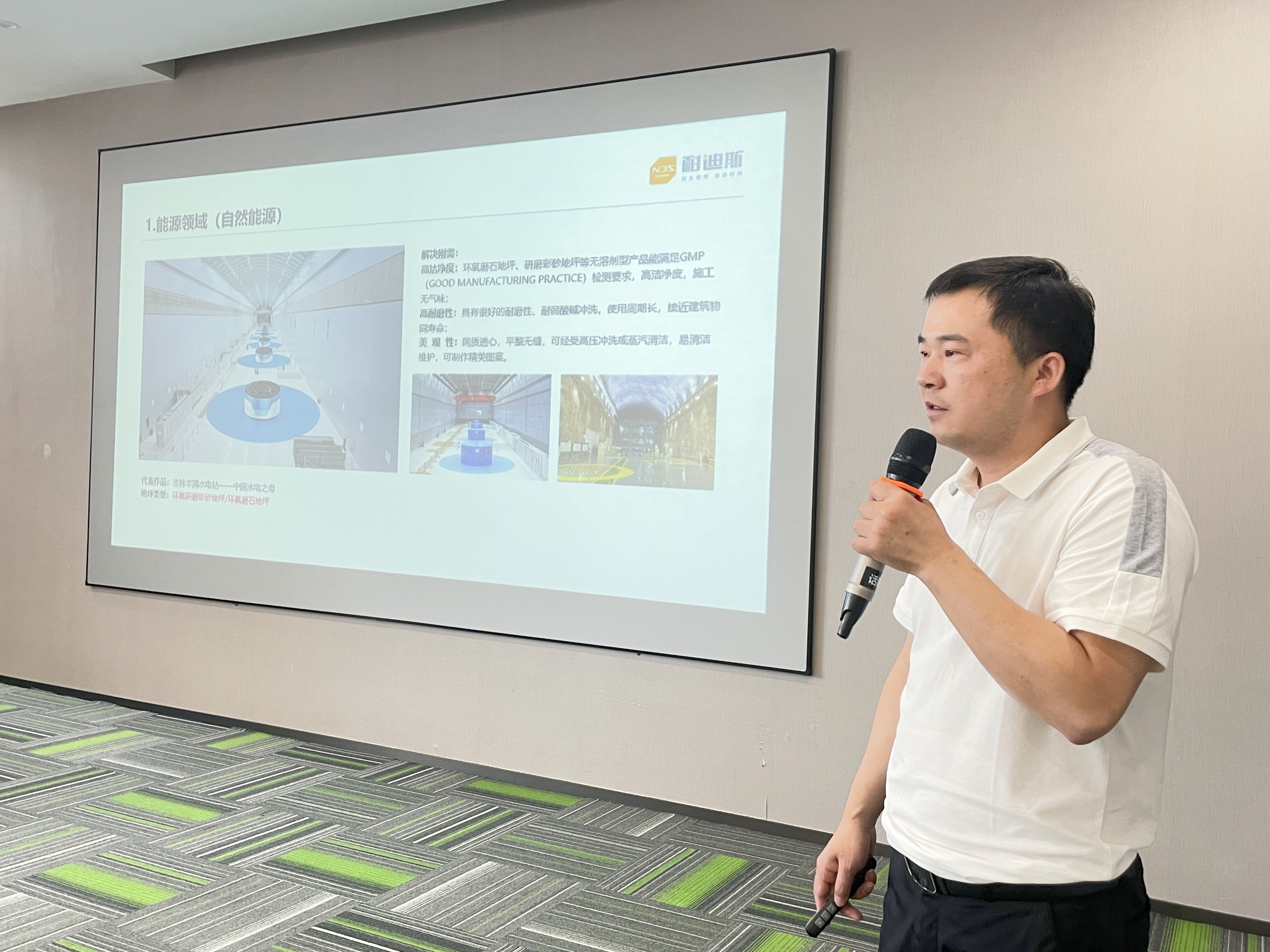 紧接着的第二部分,集中展示了Nedis耐迪斯的部分核心产品,包括自流平彩砂、圆弧角、防静电系列等产品的现场实操演示。