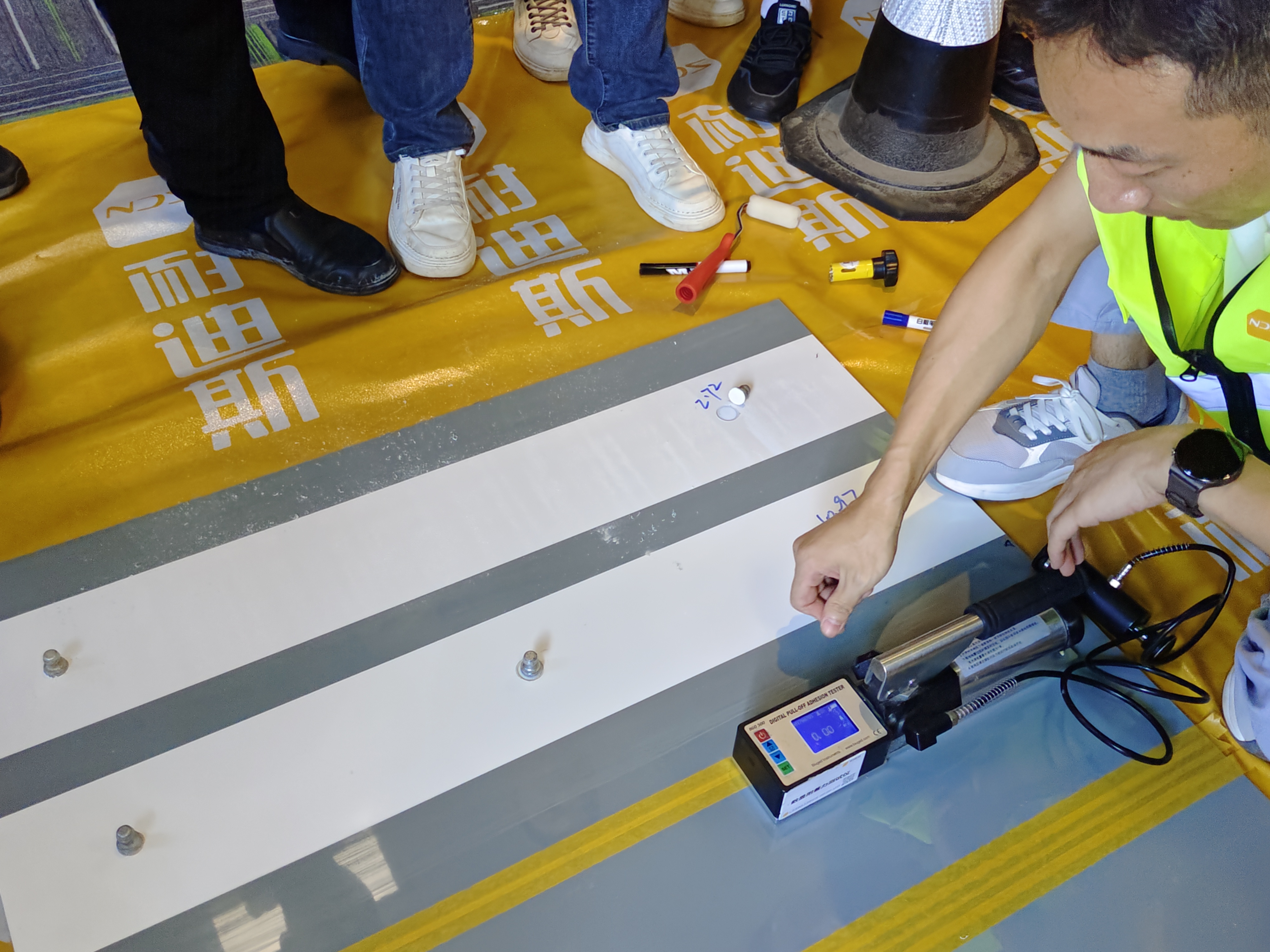 实操环节分为两个部分。第一部分,划线漆的现场测试成为了焦点。测试项目覆盖了拉伸粘结强度、抗划伤性、光泽度、干燥时间等多个关键指标。